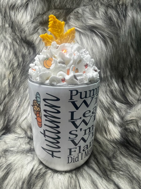 THIS 12OZ STAINLESS WINE TUMBLER HOLDS HOT OR COLD LIQUIDS. IT HAS AN AUTUMN PRINT ON EACH SIDE AND INCLUDES AN AUTUMN/PUMKIN INSPIRED TOPPER. SHIPPING INCLUDED IN THE US ONLY.