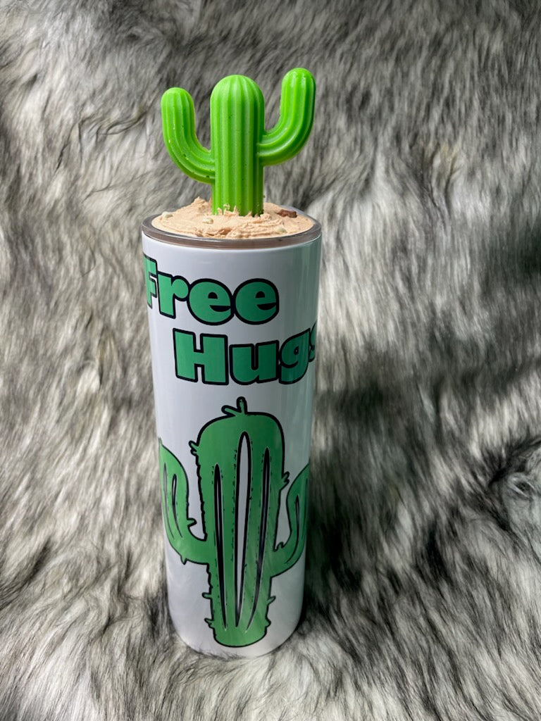 THIS 20OZ STAINLESS TUMBLER HOLDS HOT OR COLD LIQUIDS. IT HAS A PRINT WITH A CACTUS "FREE HUGS" WRAP AND INCLUDES A FAUX-CACTUS/DESERT TOPPER. SHIPPING INCLUDED IN THE US ONLY.