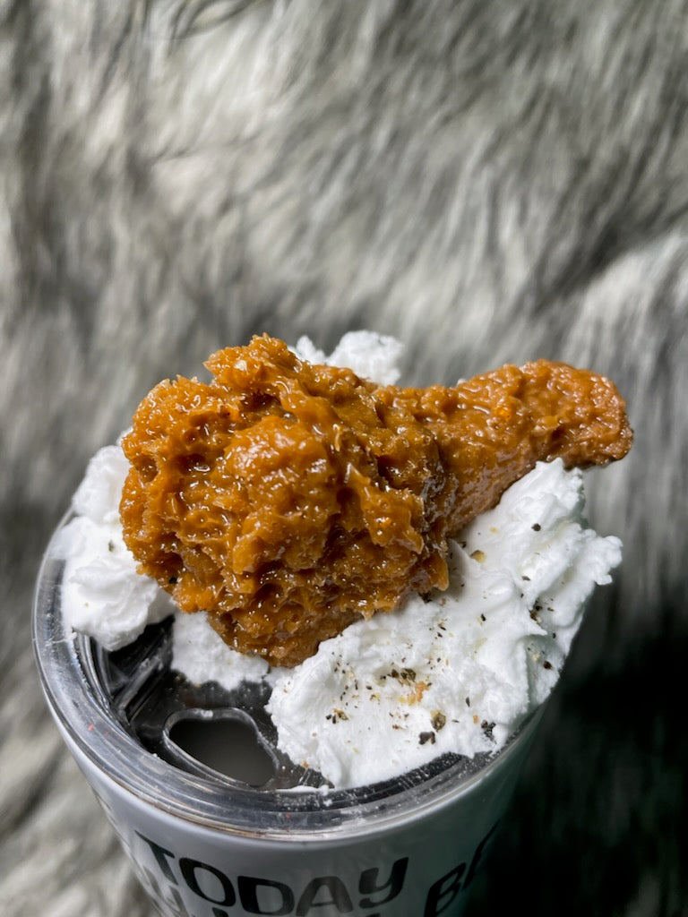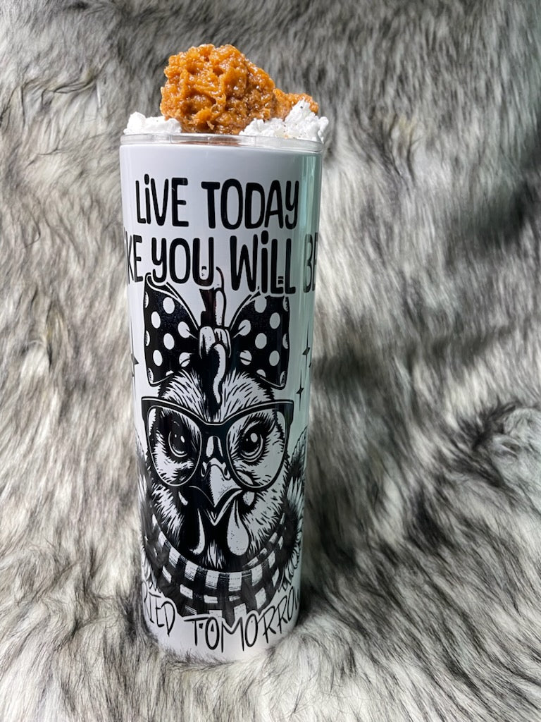 THIS 20OZ STAINLESS TUMBLER HOLDS HOT OR COLD LIQUIDS. IT HAS A PRINT WITH "LIVE TODAY LIKE YOU WILL BE FRIED TOMORROW" WRAP AND INCLUDES A FAUX-FRIED CHICKEN LEG & MASHED POTATO TOPPER. SHIPPING INCLUDED IN THE US ONLY.