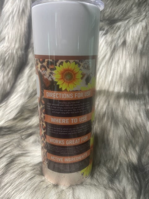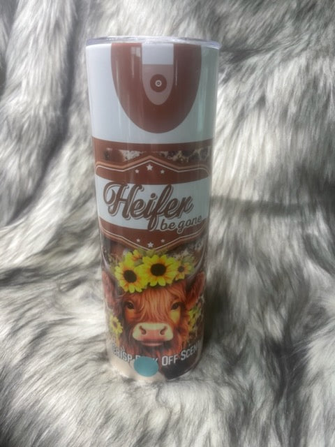 THIS 20OZ STAINLESS TUMBLER HOLDS HOT OR COLD LIQUIDS. IT HAS A FAUX-SPRAY CAN PRINT WITH "HEIFER BE GONE" WRAP (NAUGHTY WORD COVERED IN PHOTO). SHIPPING INCLUDED IN THE US ONLY.