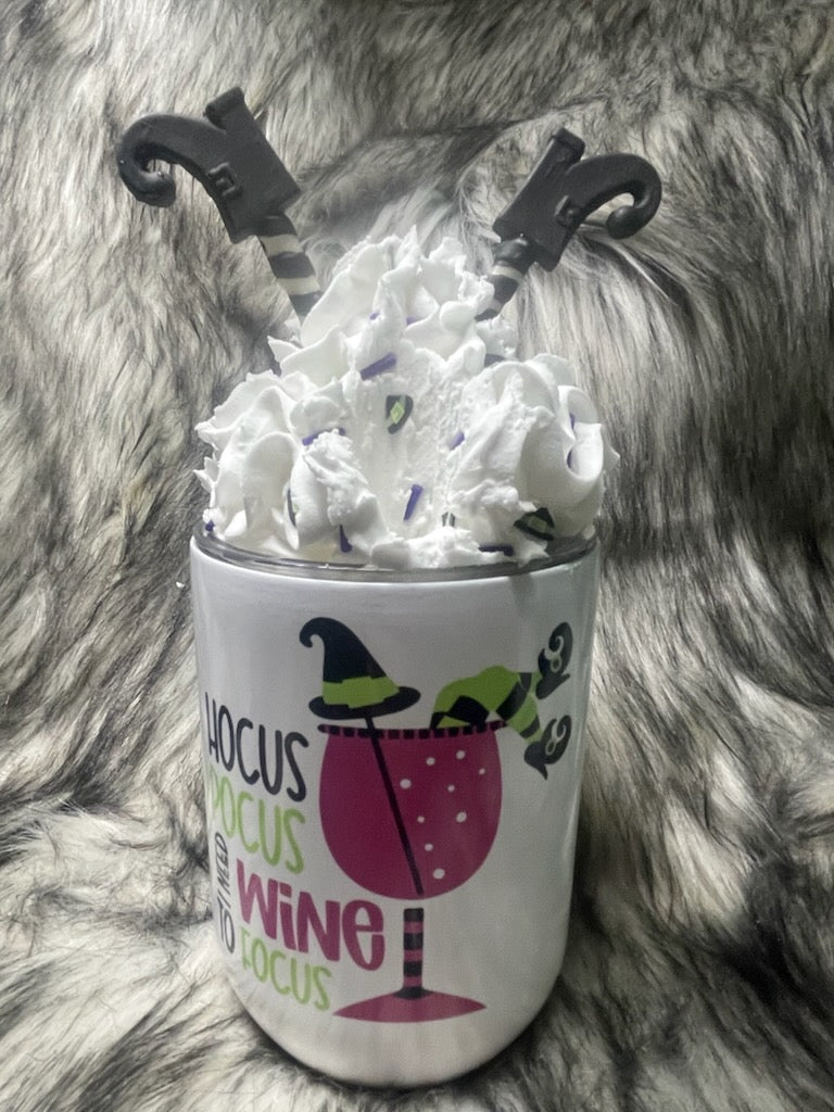 THIS 12OZ STAINLESS TUMBLER HOLDS HOT OR COLD LIQUIDS. IT HAS A PRINT WITH "HOCUS POCUS I NEED WINE TO POCUS" DESIGN ON EACH SIDE AND INCLUDES A FAUX-WHIPPED CREAM TOPPER. SHIPPING INCLUDED IN THE US ONLY.