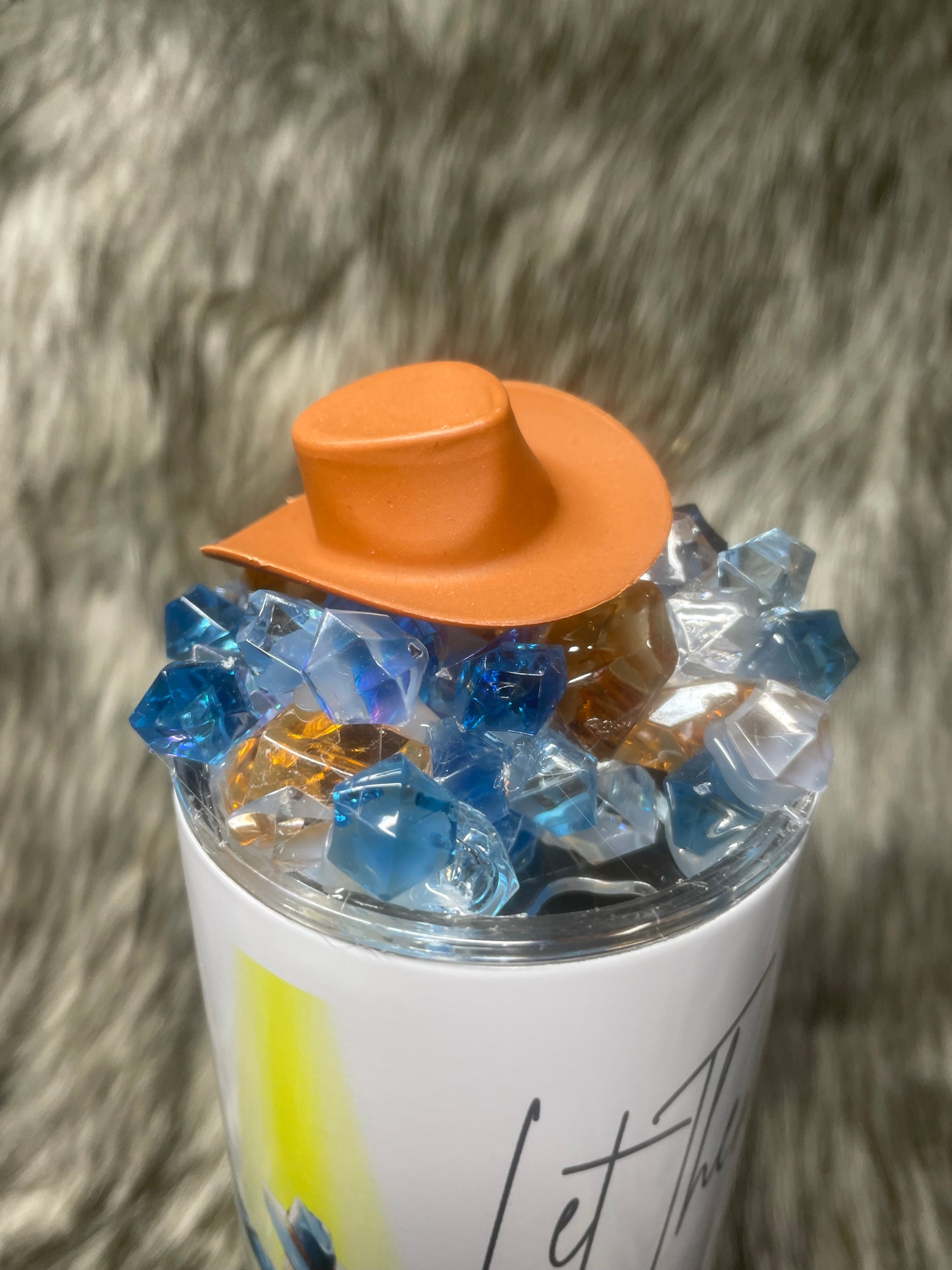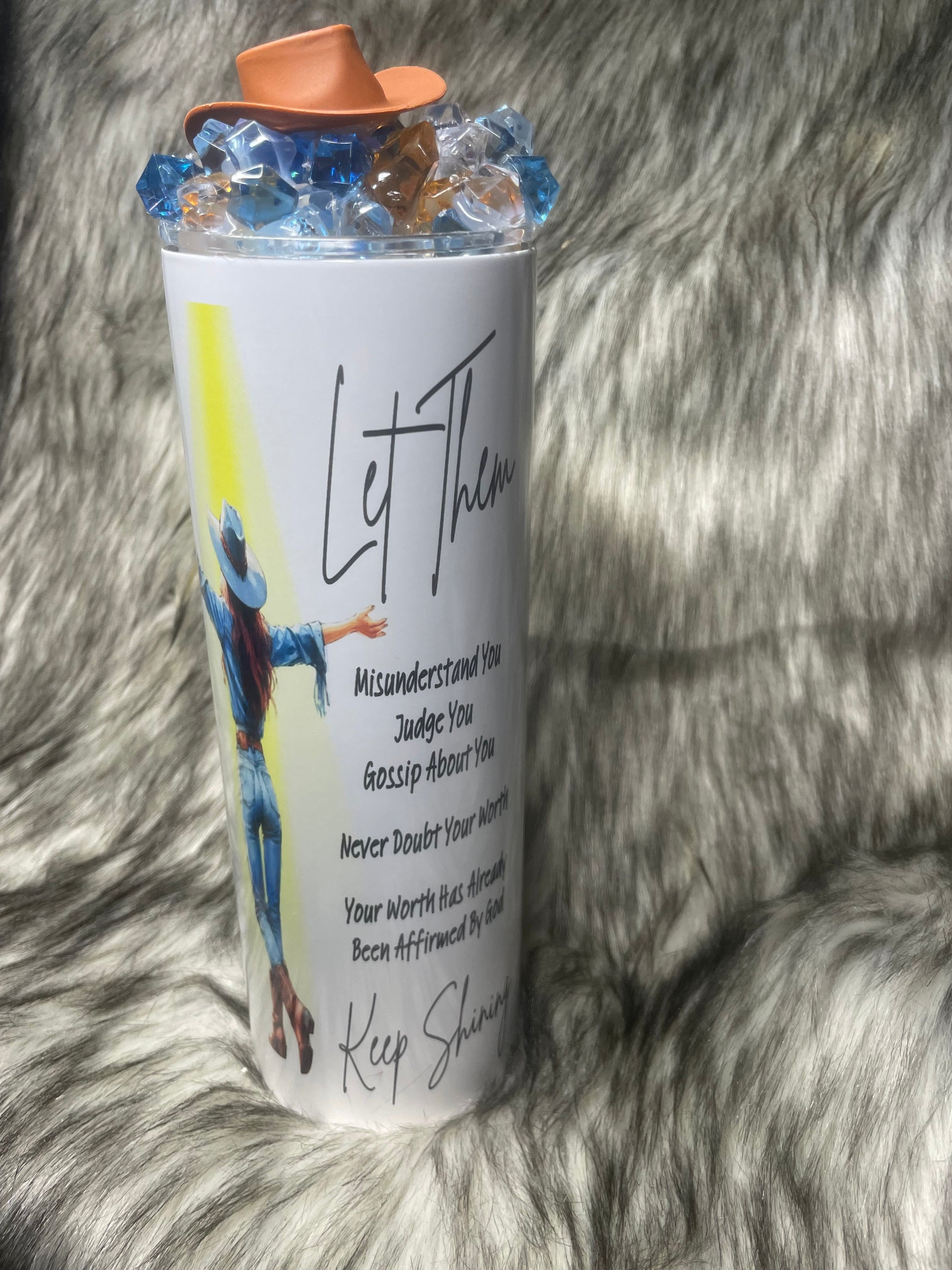 This 20 oz stainless tumbler has a beautiful message, “let them”, with a cowgirl scene. This has a faux-ice matching topper with a mini cowgirl hat to match. This cup has print on both sides. Includes clear plastic lid and straw, shipping included in the US