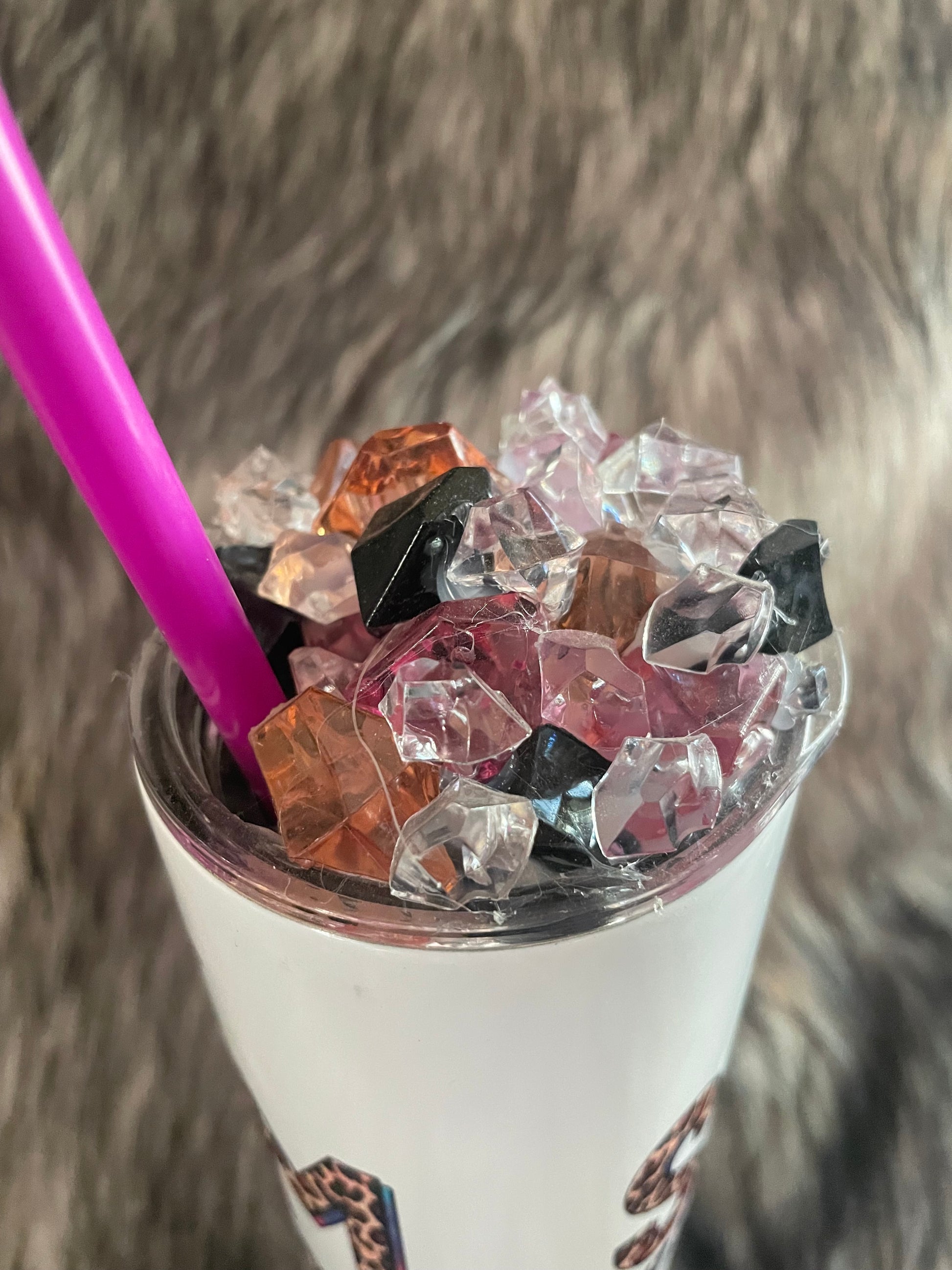 This 20 oz stainless tumbler is perfect for hot or cold liquids. This cup has a funny “not slim, kinda shady” print on both sides. Includes clear plastic straw and lid as well as matching faux-ice topper