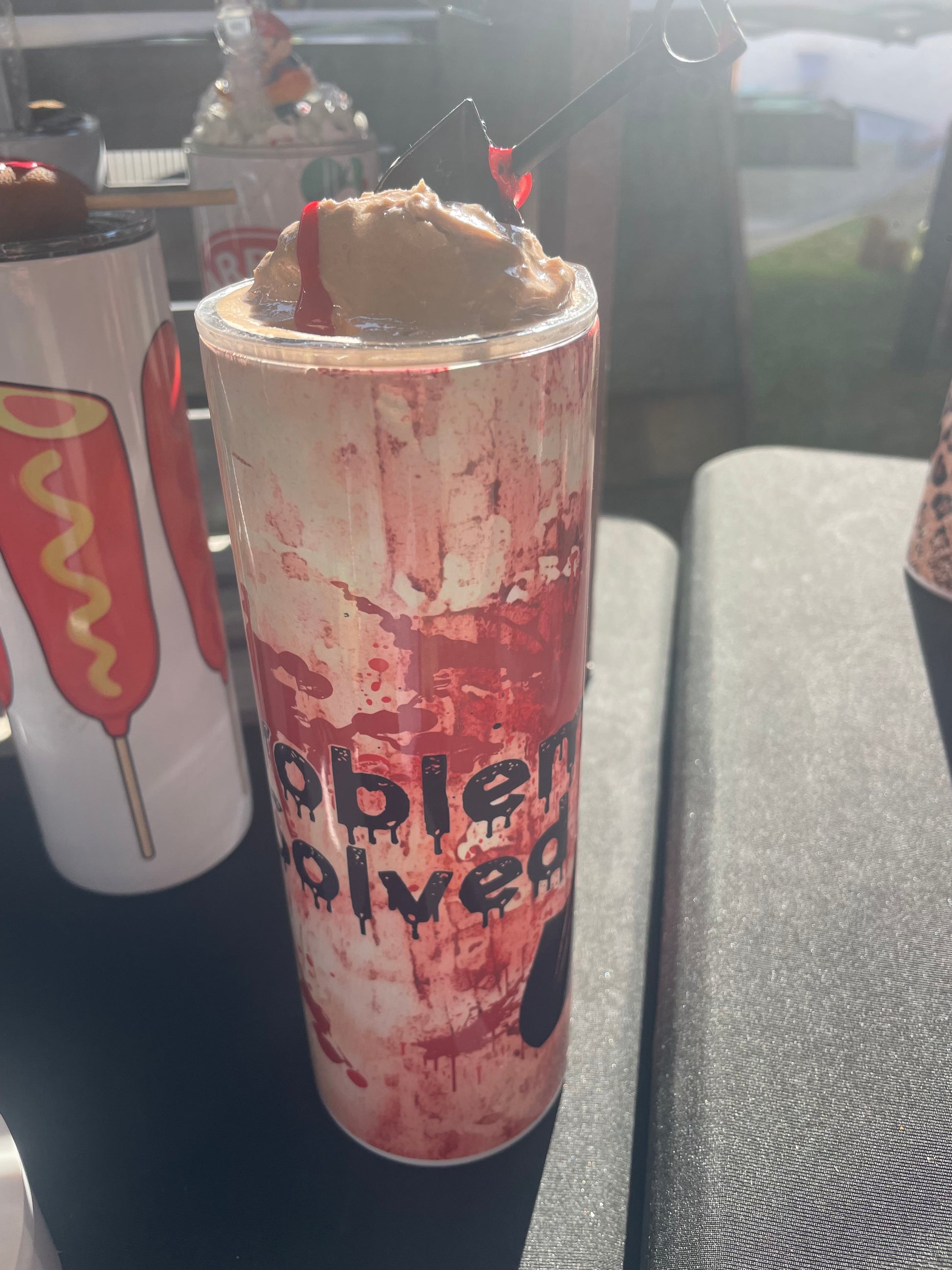 This 20 oz stainless tumbler has a funny “problem solved” wrap with a faux-blood matching topper with shovel and grave. Shipping is included in the US