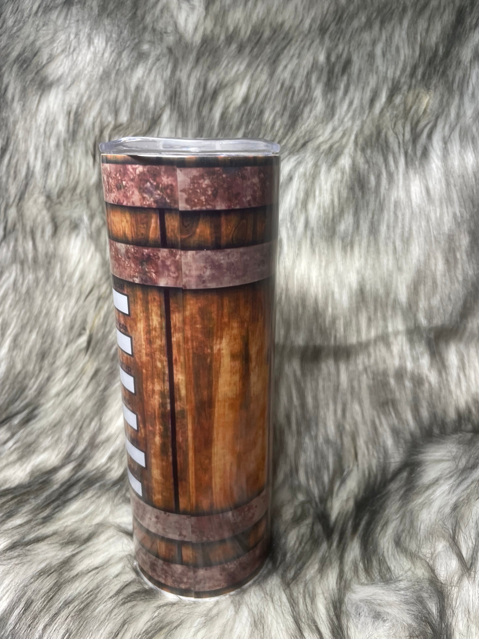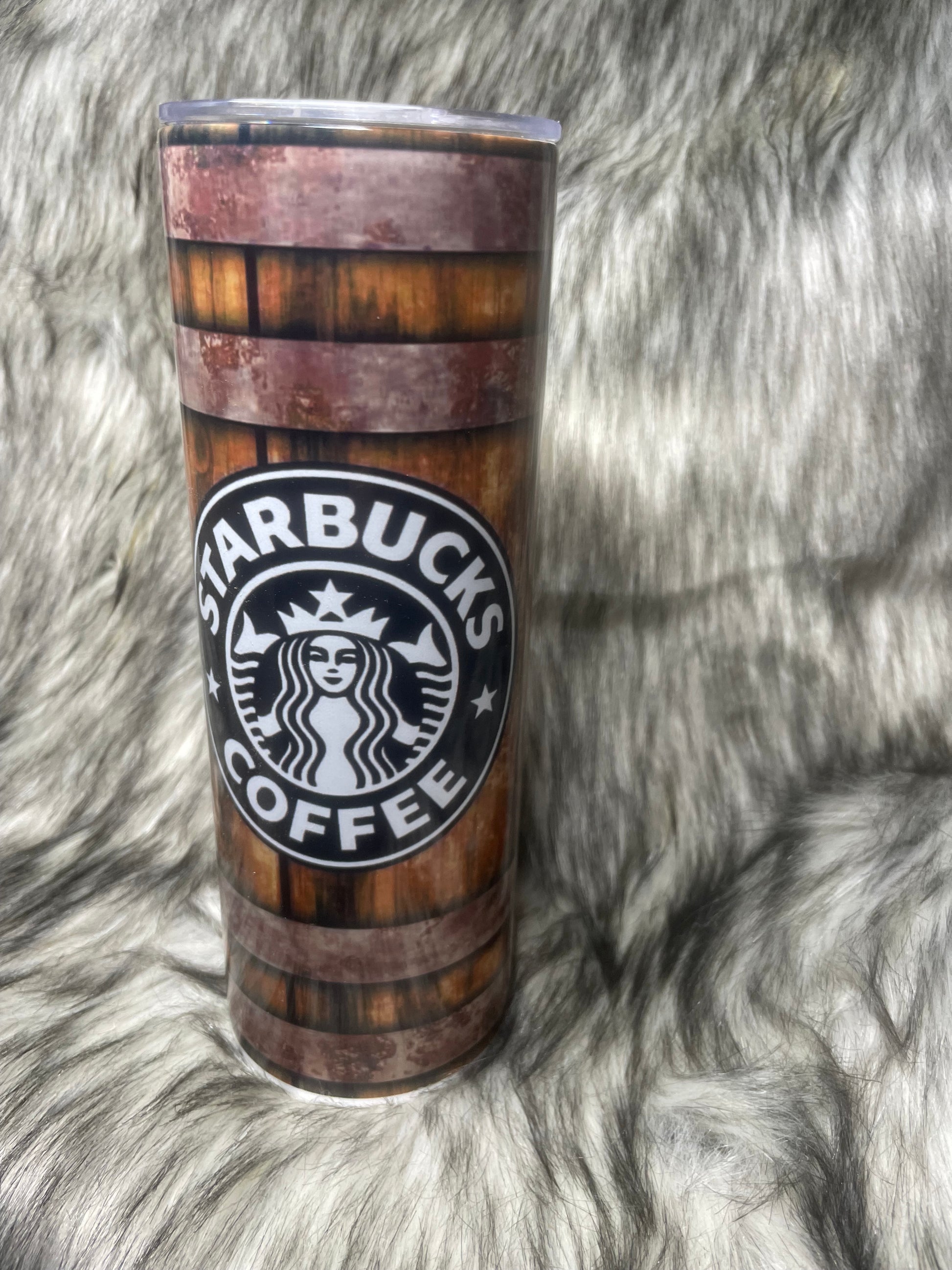 This 20 oz stainless tumbler has a beautiful barrel wrap with Starbucks logo. It includes a clear plastic lid. Shipping is free in the US