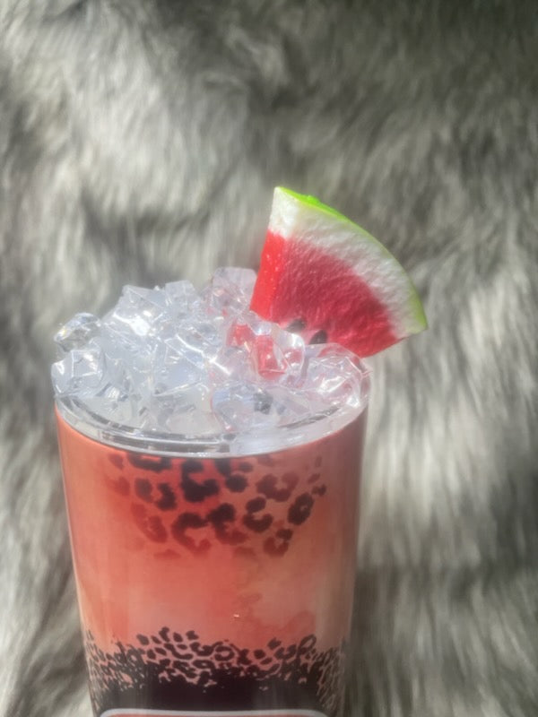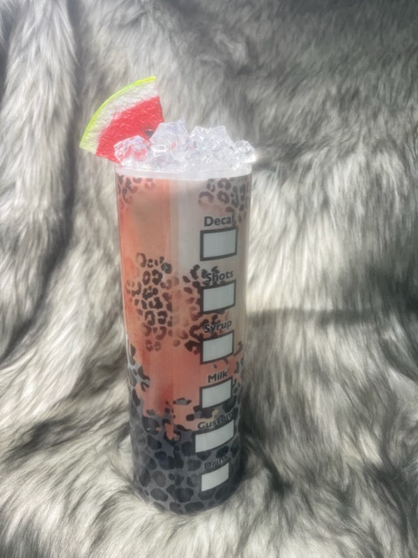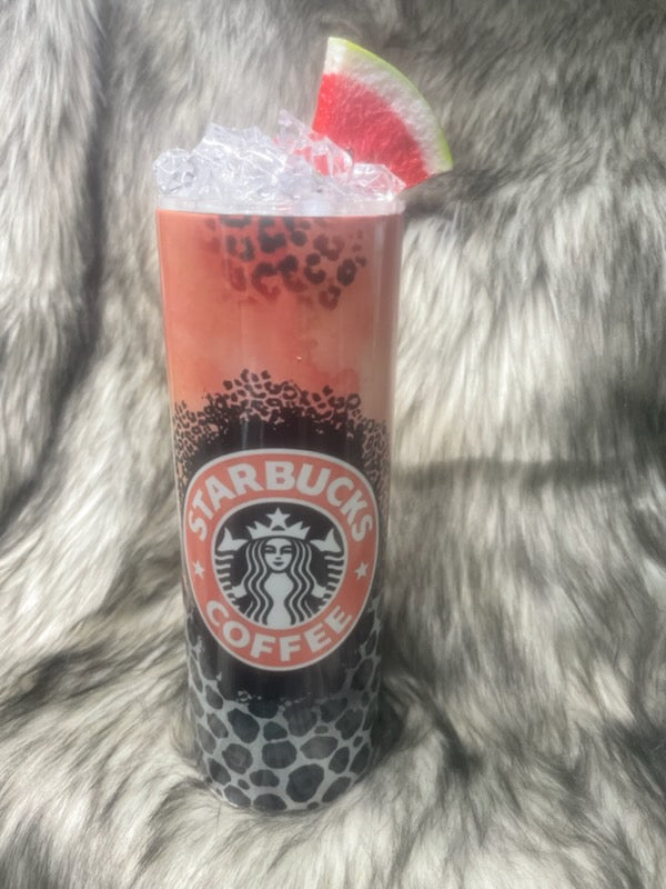 THIS 20OZ STAINLESS TUMBLER HOLDS HOT OR COLD LIQUIDS. IT HAS A TANGERINE/PEACH-COLORED PRINT WITH STARBUCKS LOGO & LEOPARD PRINT. INCLUDES A MATCHING CUSTOM TOPPER. SHIPPING INCLUDED IN THE US ONLY.