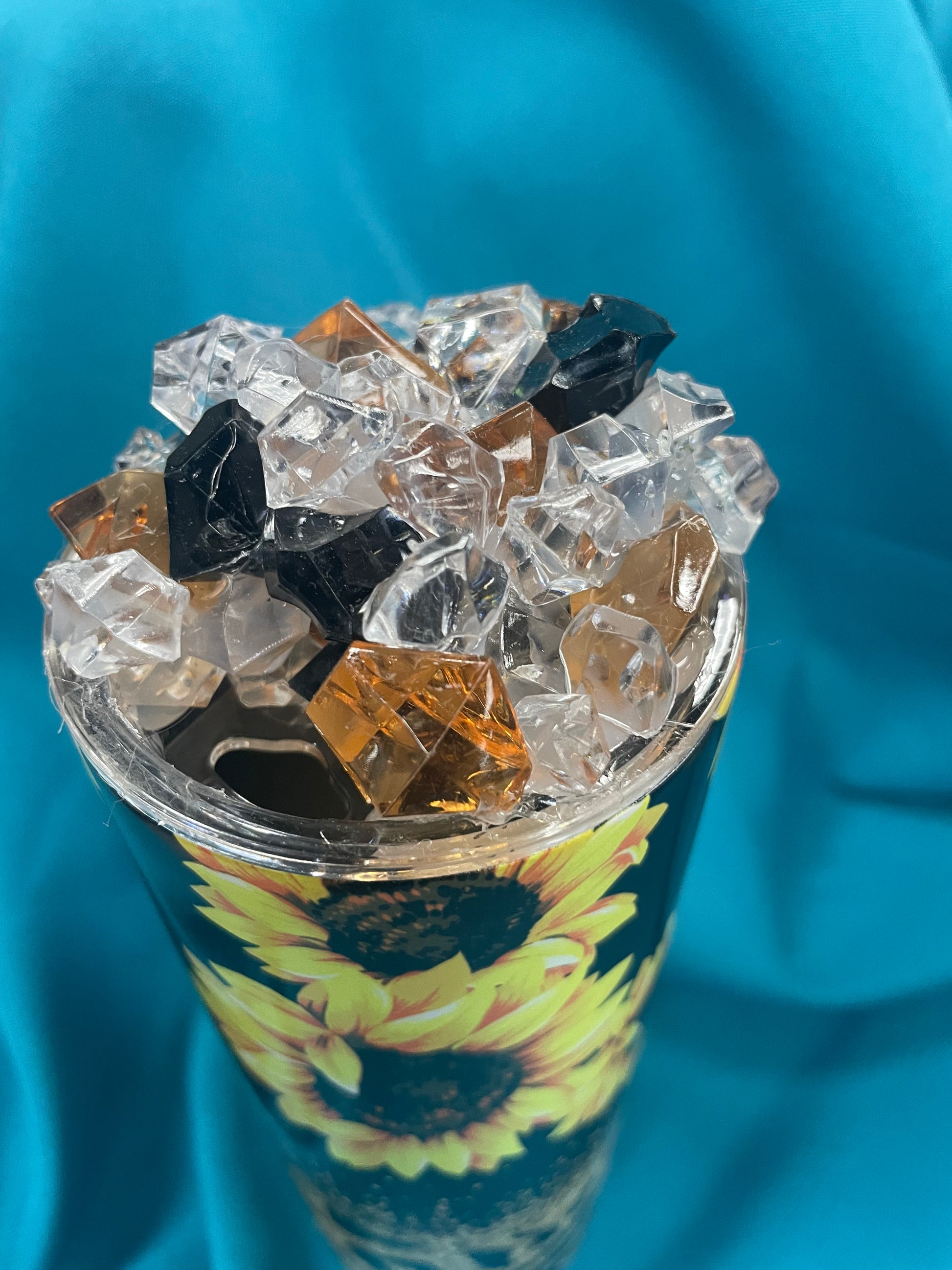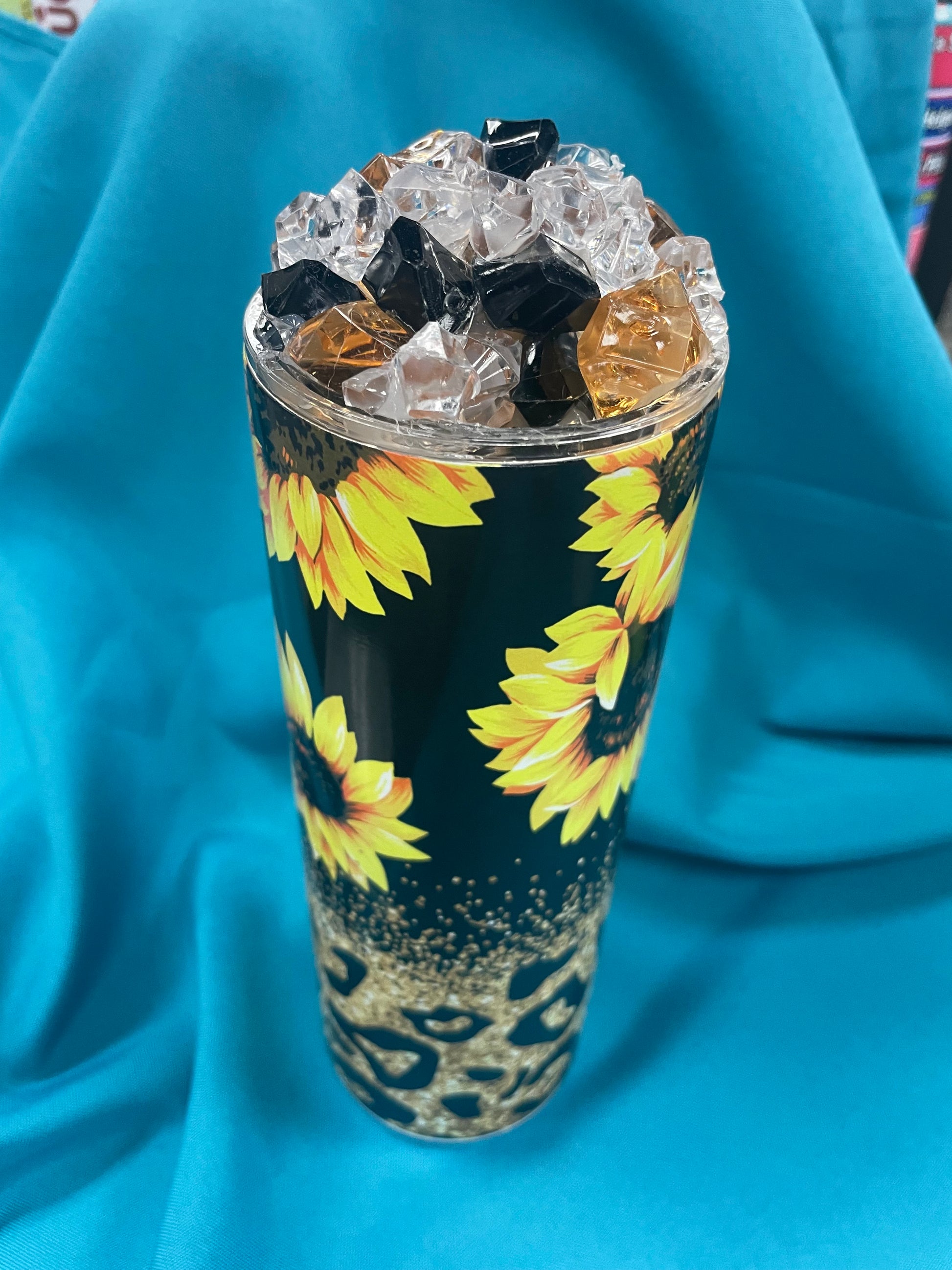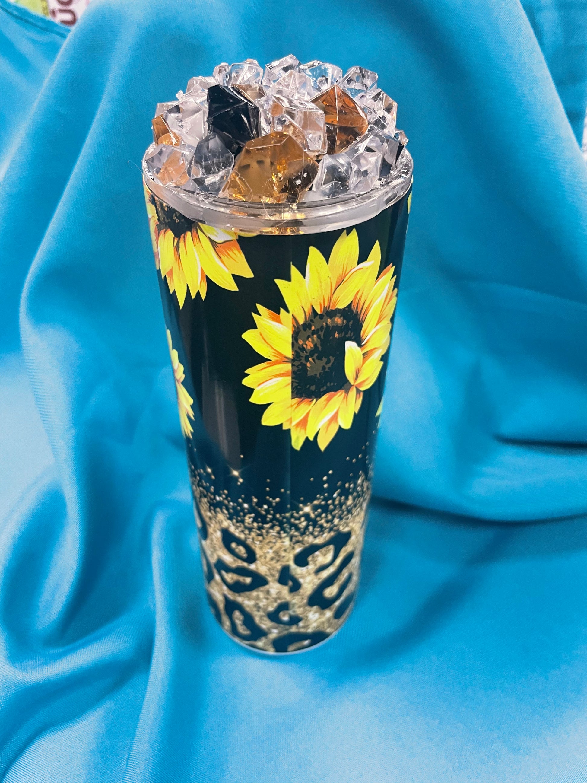 This 20 oz stainless tumbler is perfect for hot or cold liquids. It has a beautiful sunflower and leopard wrap. It includes clear plastic straw and lid, as well as matching g faux-ice topper. Shipping free in the US