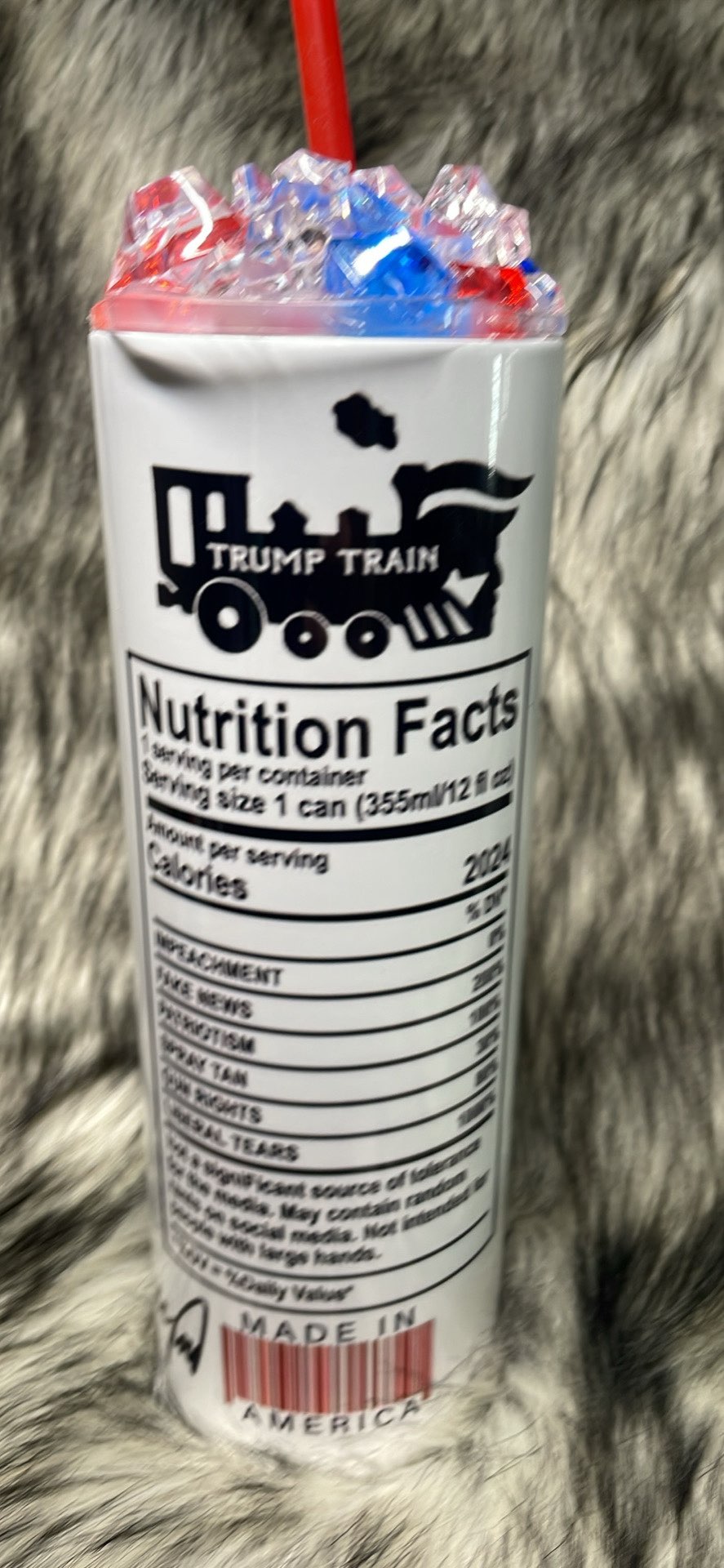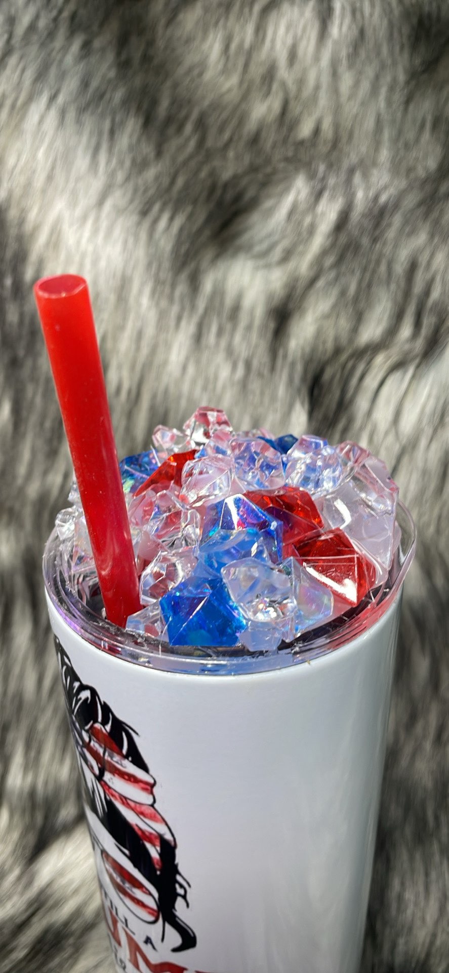 THIS 20OZ STAINLESS TUMBLER HOLDS HOT OR COLD LIQUIDS. IT HAS A PRINT WITH "TRUMP GIRL" WRAP AND INCLUDES A FAUX-ICE MATCHING TOPPER. SHIPPING INCLUDED IN THE US ONLY.