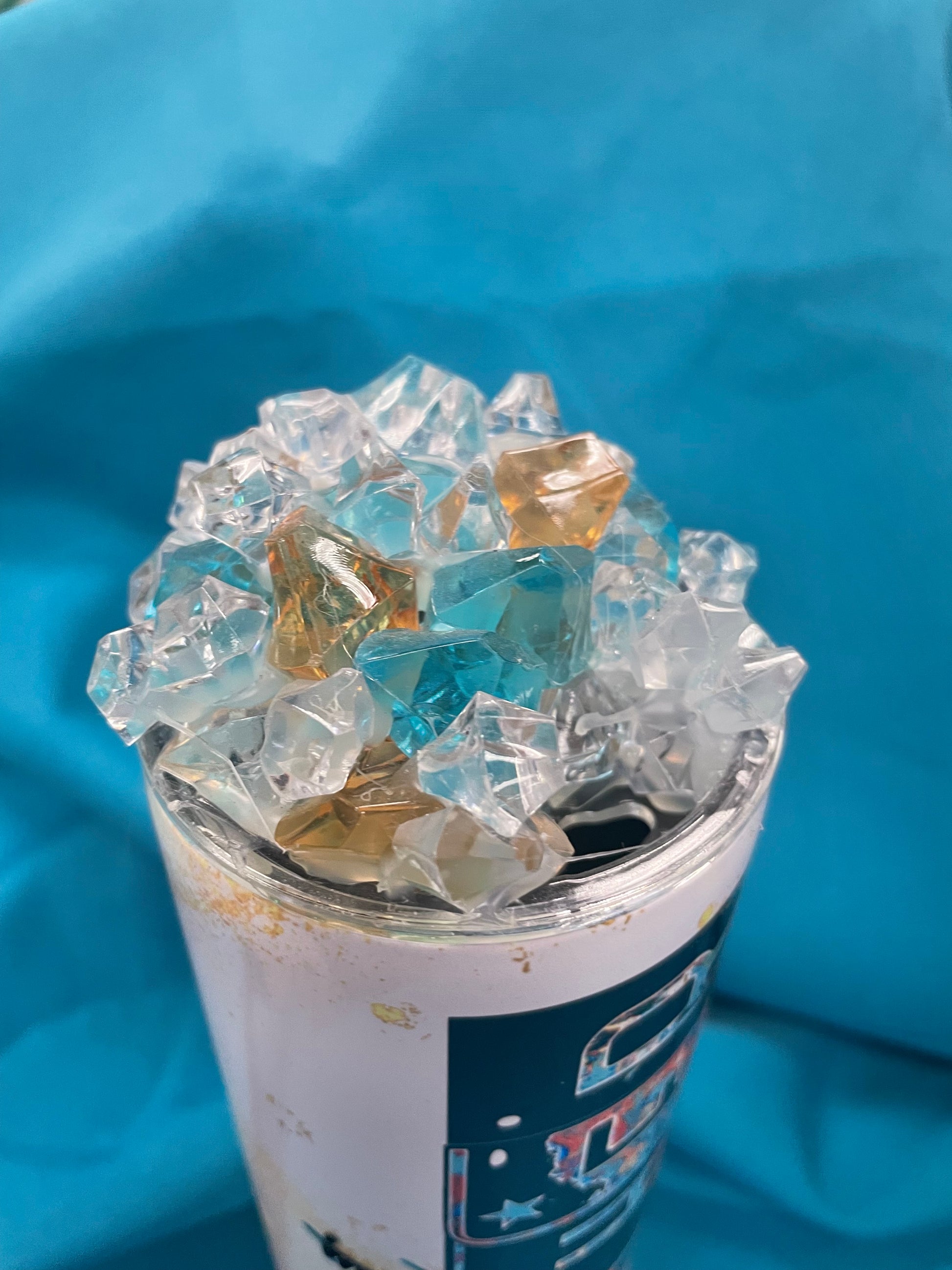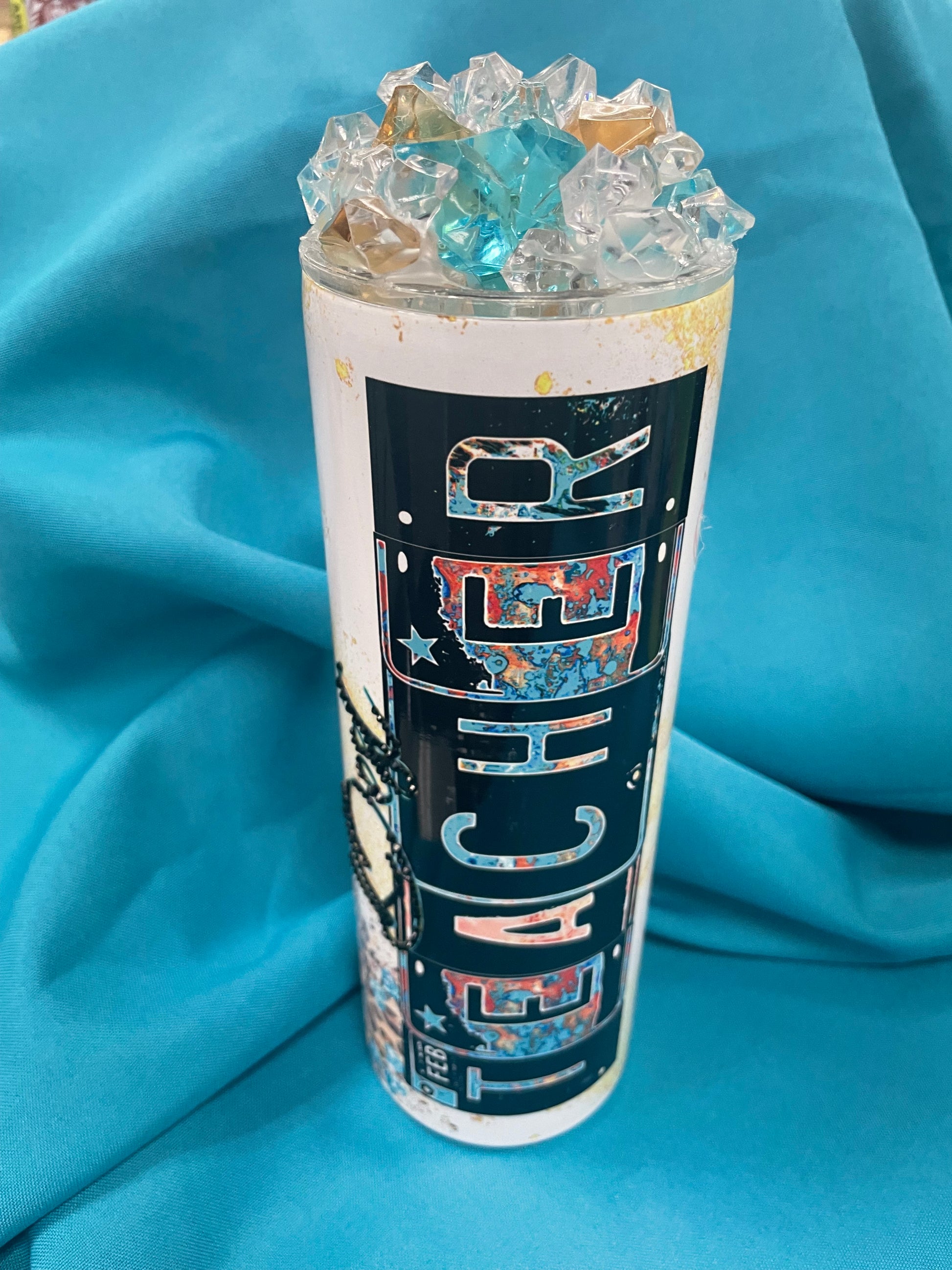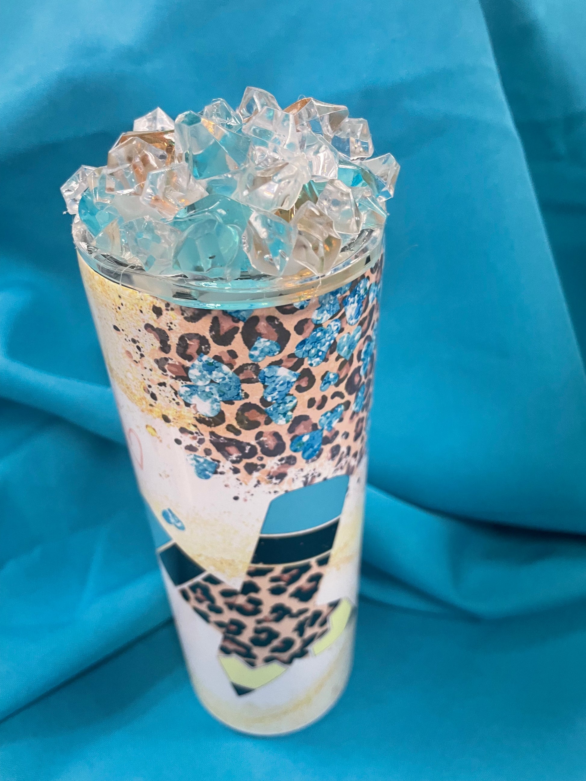 This 20 oz stainless tumbler is perfect for hot or cold liquids. This has a pretty leopard/teal/western wrap that any teacher would love. Includes clear plastic straw and lid, as well as matching g faux-ice topper. Shipping free in the US